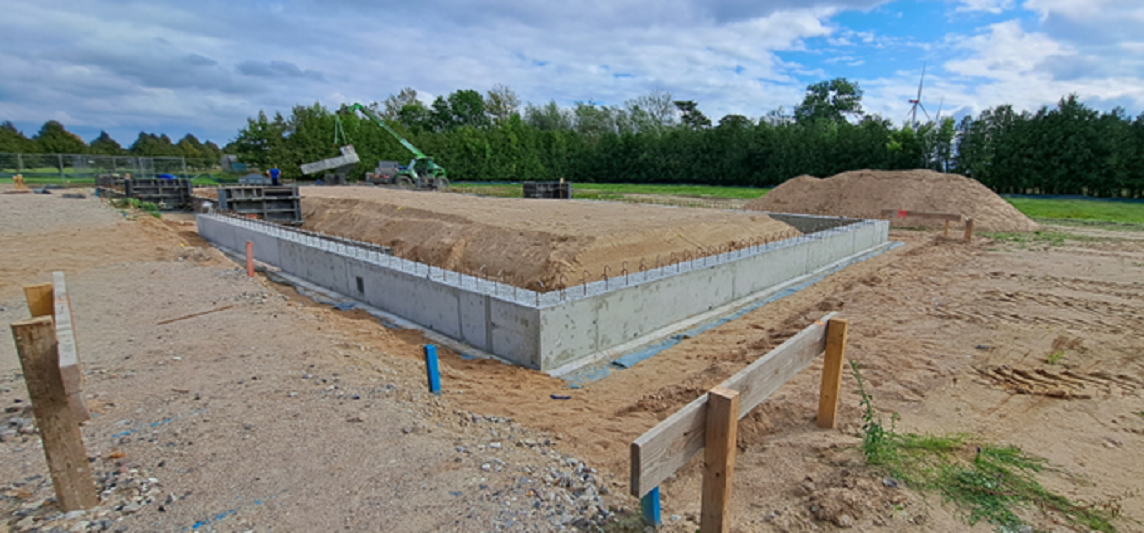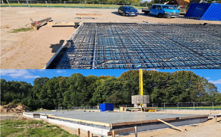 - Die Bodenplatte: im Oktober 2025 starteten die Bewehrungsarbeiten. Nach der erfolgreichen Abnahme wurde die massive Stahlbeton-Bodenplatte gegossen