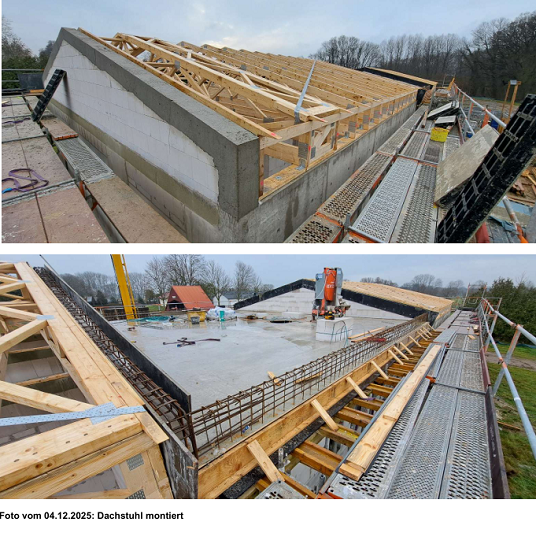 - Zimmererarbeiten: im Dezember 2025 wurde die Dachkonstruktion fertiggestellt