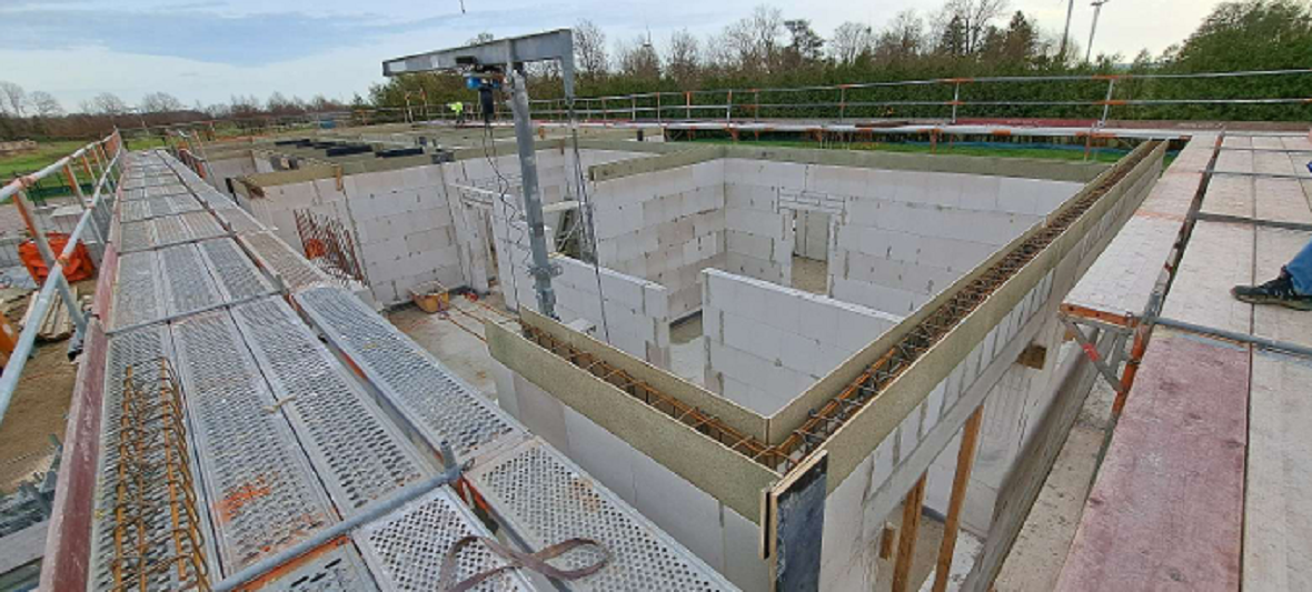 - Giebel & Decken: Zum Monatsende wurden die Deckenelemente aufgelegt und die Mauerwerksarbeiten an den Giebeln fertiggestellt
