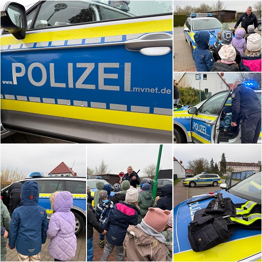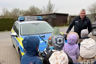 Im Hummelnest war viel los: Zwei Polizeiautos von der Wache Bad Doberan und zwei Beamte besuchten die Kinder und sorgten für große Begeisterung.