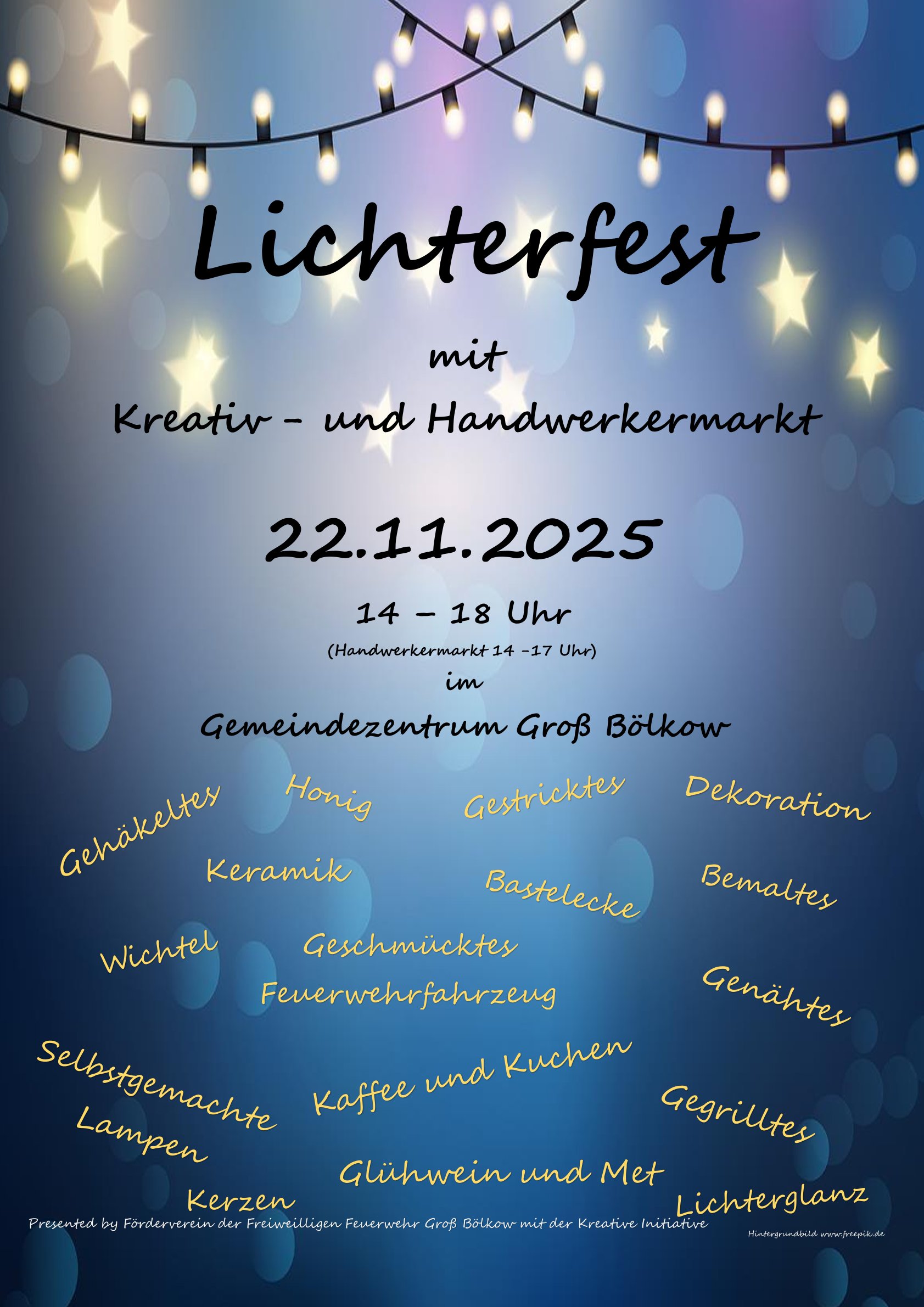 Am 23. November findet im Gemeindezentrum Groß Bölkow ein stimmungsvolles Lichterfest mit Kreativ- und Handwerkermarkt statt. Von 14 bis 18 Uhr können Besucherinnen und Besucher eine vielfältige Auswahl an handgefertigten Produkten, originellen Geschenkideen und kreativen Angeboten entdecken.
