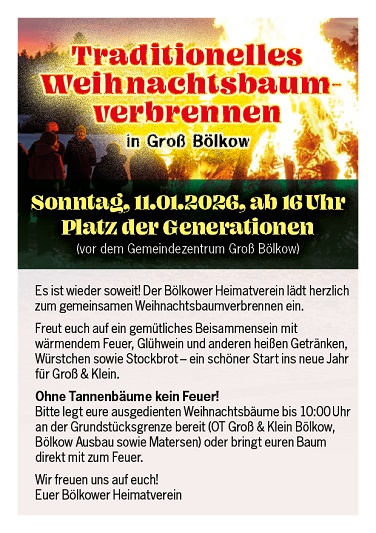 Es ist wieder soweit! Der Bölkower Heimatverein lädt herzlich zum gemeinsamen Weihnachtsbaumverbrennen ein.